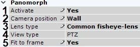 If you are using a fish-eye camera or video camera with a panomorph lens, configure the following settings of the Video camera object, in the Panomorph settings group: