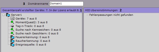 Bei der Auswahl des Objekts Axxon-Domain werden in der Gruppe Geräte erstellt gesamt Informationen über die Axxon-Domain und die aktuelle Lizenz angezeigt: Server und deren Anzahl, IP-Geräte und diverse nutzbare Funktionen (1).