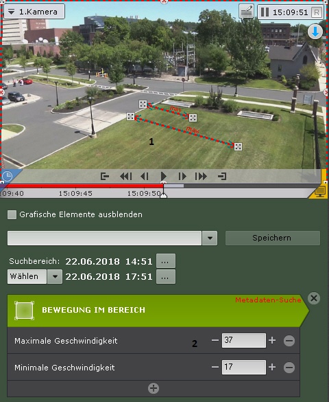 2. Verwenden Sie die Schaltflächen, um die minimale (maximale) Geschwindigkeit des Objektes in Form von Prozentanteilen des Bildes pro Sekunde festzulegen. Die Größen des Pfeils im Kamerafenster können auf gleiche Art verändert werden (2).