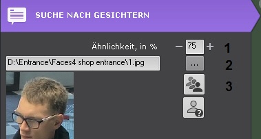 2. Das Mindestniveau der Ähnlichkeit des Gesichts (in Prozent) auf dem gewählten Bild mit den Gesichtern im Archiv eingeben (1). In Suchergebnissen werden nur Videos angezeigt, in denen Gesichter mit einem  höheren als dem vorgegebenen Ähnlichkeitsniveau vorkommen.