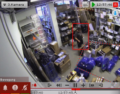 Wenn der Alarm automatisch ausgelöst wurde, wird das visuelle Element, welches für den Detektor, der der Alarm initiiert hat, eingestellt war, im Kamerafenster angezeigt: entweder ein Erfassungsbereich oder eine Linie, die, wenn sie überquert wird, einen Detektor auslöst. Das Objekt, welches den Detektor ausgelöst hat, wird von einem roten Rahmen umgeben.