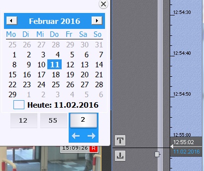 Das Einzelbild, das der gewählten Position (Zeitpunkt) entspricht, wird dann im Kamerafenster angezeigt.Klicken Sie auf den Zeiger, um den Kalender zu öffnen. Wählen Sie das Datum aus, zu dem im Archiv gegangen werden soll, und geben Sie mit Hilfe der Pfeile oder über die Tastatur die Zeit im Format HH:MM:SS ein.