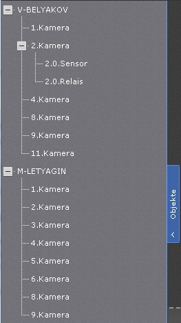 In der Objektleiste werden die Kameras aller Server angezeigt, die zur C-Werk-Domain gehören, sofern der aktuelle Benutzer auf sie zugreifen kann.