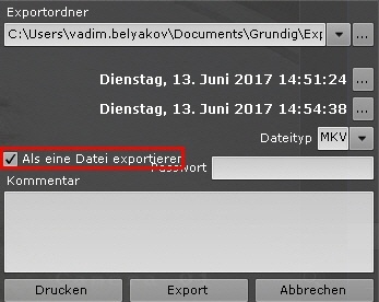 Der Export erfolgt für jede Kamera in eine separate Datei. Der beim Export eingegebene Kommentar wird zu jeder exportierten Videoaufnahme hinzugefügt.