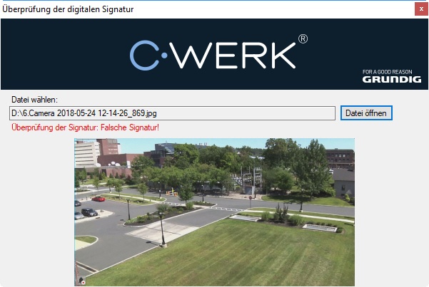 Zur Kontrolle der digitalen Signatur klicken Sie auf Öffnen, und wählen Sie die Datei des exportierten Standbilds oder der Videoaufnahme.