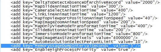 Suchen Sie den Parameter MemoryUsageDumpIntervalSeconds, und geben Sie dafür einen der Dauer der Hinzufügung von Informationen ins Log entsprechenden Wert in Sekunden ein.