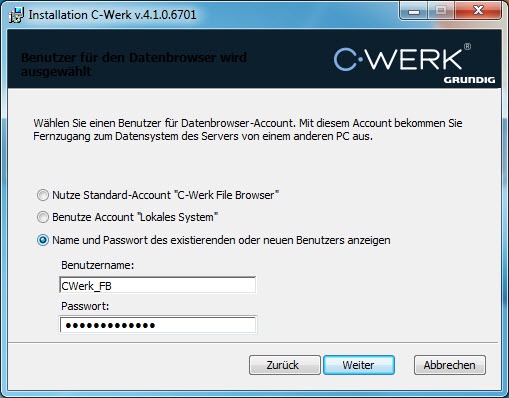 1. Erstellen Sie ein neues Konto, der voreingestellte Name dafür lautet C-Werk File Browser.