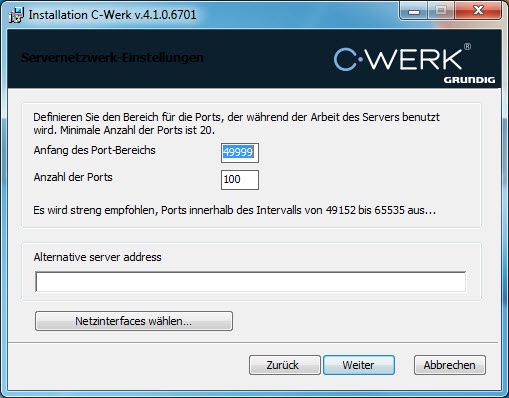 22. Des Weiteren erscheint ein Dialogfenster mit den Installationsparametern der Software C-Werk in Übereinstimmung mit dem ausgewählten Konfigurationstyp.
