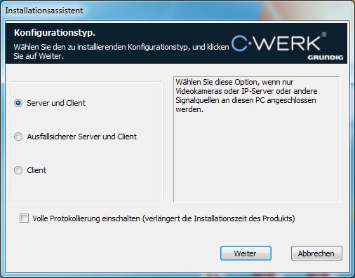 4. Wählen Sie den Konfigurationstyp der Software C-Werk im Dialogfenster aus, indem Sie das entsprechende Optionsfeld aktivieren:
