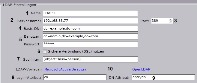 Zur Eingabe des Login- und DN-Attributs können Sie die Vorlagen LDAP Microsoft Active Directory und OpenLDAP verwenden. Zur Verwendung der Vorlage müssen Sie auf den entsprechenden Link klicken (10).