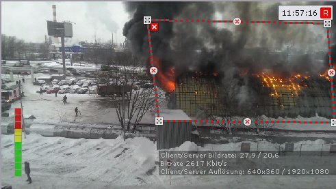 Wenn Sie den Empfindlichkeitswert erhöhen, werden mehr Alarme erzeugt (rote Skala).Im Vorschaufenster können Sie die Erkennungsbereiche mit Hilfe von Ankerpunkten ähnlich wie Privatsphärenausblendungen in Scene Analytics (Situationsanalysedetektoren) festlegen. In der Voreinstellung stellt jeder Erfassungsbereich eine Erfassungszone dar.