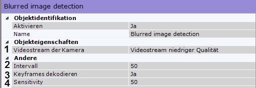 Um die Erkennung von Bildrauschen, Bildunschärfen und Komprimierungsartefakten zu konfigurieren, gehen Sie wie folgt vor: Legen Sie die Empfindlichkeit in Standard-Einheiten von 0 bis 100 (4) fest.