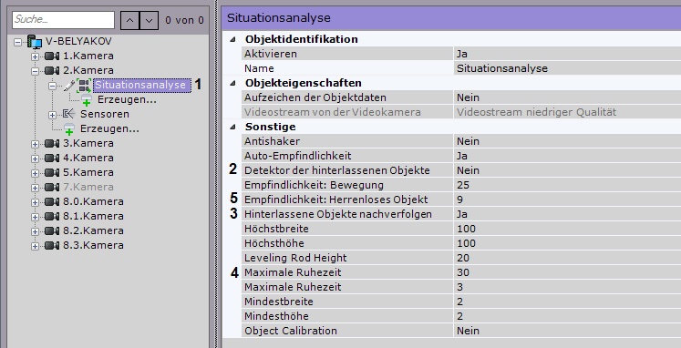 Geben Sie die Empfindlichkeit des Situationsanalysedetektors im Feld Empfindlichkeit gegenüber dem herrenlosen Objekt (5) im Bereich [5, 30] ein.