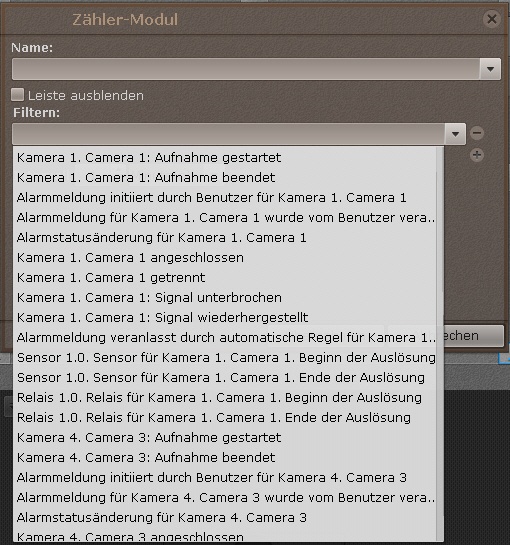Zum Hinzufügen von Ereignissen eines einzigen Typs von verschiedenen Geräten müssen Sie den Text des jeweiligen Ereignisses im Feld Filter eingeben. Es sind dann in der Liste nur Ereignisse des angegebenen Typs verfügbar. Um zur vollständigen Ereignisliste zurückzukehren, wählen Sie ein beliebiges Ereignis und löschen Sie die FilterzeileHinweis