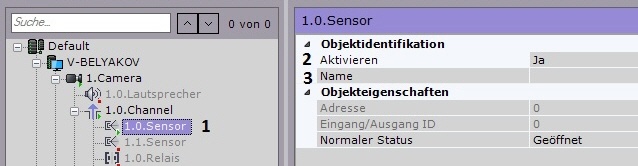Das Objekt Sensor wird im Objektbaum als untergeordnetes Objekt des Objekts Kanal angezeigt, sofern die Videokamera einen integrierten oder anschließbaren diskreten Eingang hat. Die Anzahl der Sensorobjekte für eine Videokamera entspricht der Anzahl der vorhandenen diskreten Eingänge.