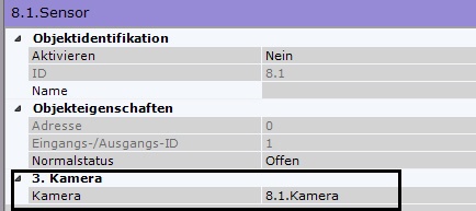 Ist der Sensor Teil eines IP-Servers, besteht die Möglichkeit, in den Sensorparametern die Videokamera des IP-Servers auszuwählen, der er zugeordnet wird. Nach Durchführung dieses Vorgangs wird das Sensorobjekt zu einem Kindobjekt in Bezug auf die gewählte Kamera.