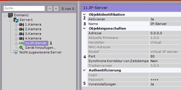 1. Wählen Sie das Objekt IP-Server im Objektbaum (1).