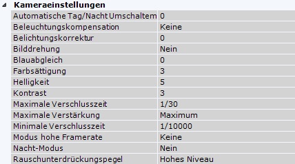 In der Gruppe Kameraeinstellungen befinden sich die Videobildparameter (Kontrast, Helligkeit, Farbsättigung u.a.). Zu deren Einrichtung ist die Beschreibung in der Oberfläche der Softwareplattform C-Werk oder detaillierter in den offiziellen Auskunftsunterlagen der Kamera zu beachten.