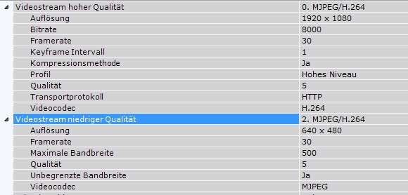 Wenn die Videokamera die gleichzeitige Übertragung mehrerer Videostreams nicht unterstützt, sind die Videostream-Parameter gleich. Dabei sind nur die Videostreamparameter für die hohe Qualität bearbeitbar (die Parameter des Videostreams geringer Qualität werden automatisch geändert).