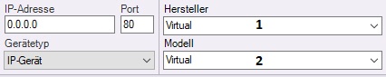 - Fügen Sie mit Hilfe des Suchmasters für IP-Geräte die Kamera hinzu, und wählen Sie im Feld Virtual (1, vgl. Erstellen und Entfernen von IP-Geräten).