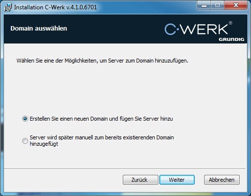 Auswahl des Servers, auf dessen Basis die neue C-Werk-Domain erstellt werden soll. Bei der Installation der Softwareplattform C-Werk mit dem Konfigurationstyp Server oder Client mit Angabe des Namens der neuen C-Werk-Domain, auch Schritt 8 der Anleitung im Abschnitt Installation).