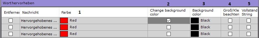 - Farbe, mit der das Wort hervorgehoben wird (1). Klicken Sie dazu in der entsprechenden Spalte auf die Schaltfläche , und wählen Sie eine Farbe aus einer von drei angebotenen Farbgruppen.