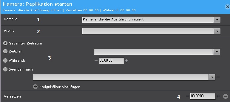 5. Geben Sie den Puffer(4) an, wenn Sie die Dauer für die Replikation angegeben haben. Videoaufnahmen des Zeitraumes [Startaktion - Puffer, Startaktion + Dauer - Puffer] werden kopiert.