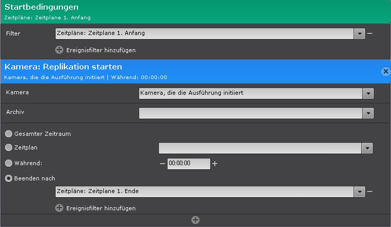 Wählen Sie ein oder mehrere Endereignisse aus. Alle Videoaufnahmen zwischen dem Startpunkt (wenn die Aktion beginnt) und dem Endpunkt (wenn das Ereignis eintrifft) werden kopiert. Wichtig! Die Replikation startet erst, wenn das Endereignis eingetroffen ist.