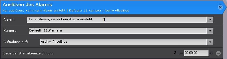 1. Alarm - Auswahl des Alarm-Modus (immer oder nur, wenn keine anderen aktiven Alarme für die Kamera vorhanden sind).