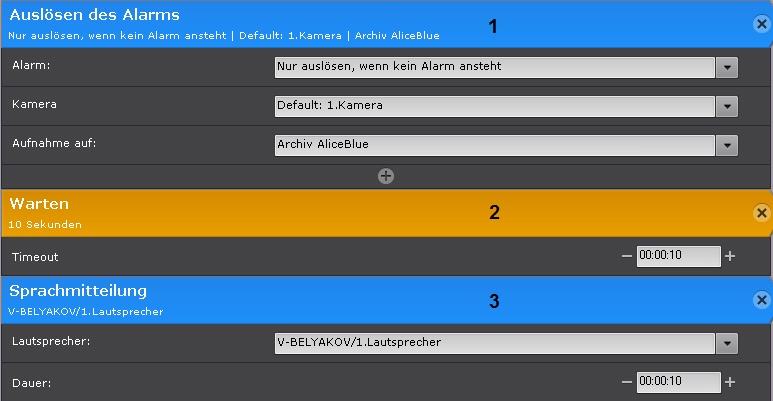 Bei Ausführung dieses Makros wird beispielsweise zuerst ein Alarm im System ausgelöst (1) und dann nach 10 Sekunden (2) eine Sprachmitteilung abgespielt (3).