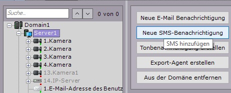 Das Objekt SMS dient der Einrichtung von SMS-Nachrichten, die dann dem Benutzer gemäß einer bei Auslösung des Detektors auszuführenden automatischen Regel zugestellt werden können.