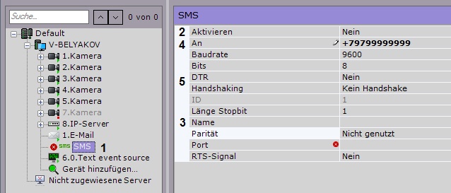 - Heben Sie in der Geräteliste das Objekt SMS hervor (1), das einzurichten ist.