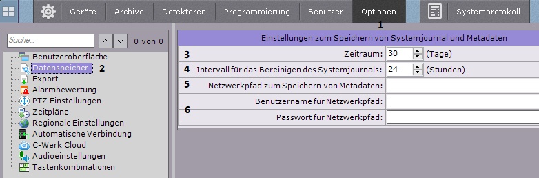 Geben Sie in dem Feld Zeitraum die Anzahl der Tage zur Speicherung des Systemprotokolls in der Serverdatenbank und zur Speicherung der Metadaten in der Vorlaufdatenbank ein (3). Bei Eingabe des Werts 0 gibt es keine Begrenzung für die Datenspeicherung. Der maximal zulässige Wert sind 1000 Tage.