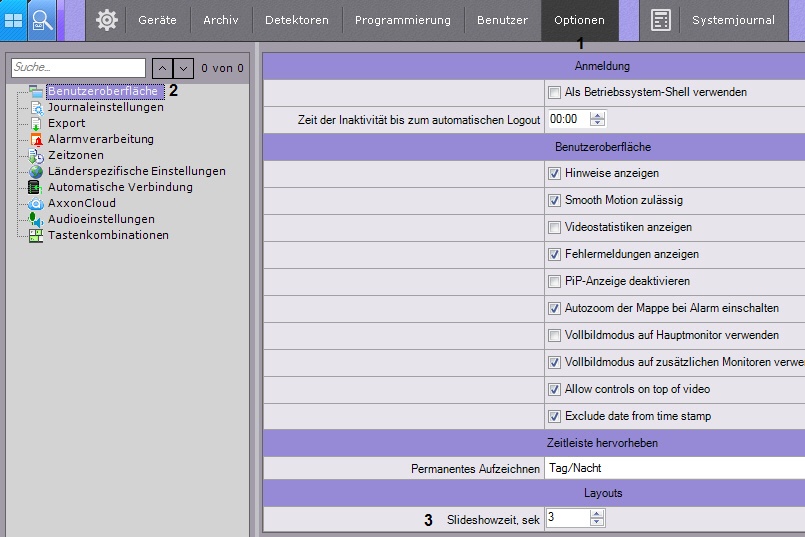 - Legen Sie in der Einstellungsgruppe Layouts im Feld Anzeigedauer eine Verweilzeit fuer jedes Layout fest (3).
