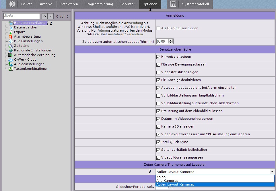 - Wählen Sie in der Registerkarte Einstellungen→ Optionen → Benutzeroberfläche (1-2).