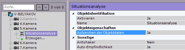 Zum Einschalten der Aufzeichnung von Metadaten in der Datenbank muss am entsprechenden Detektor (Situationsanalyse, Gesichtsdetektor, integrierter Detektor) in der Liste Aufzeichnung der Objektbahnen der Wert Ja gewählt werden.