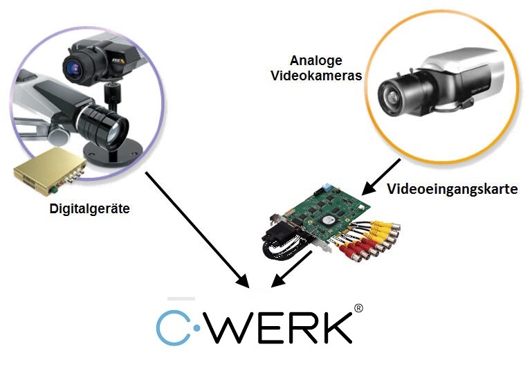 Die Softwareplattform C-Werk ermöglicht die Lösung eines breiten Spektrums von Aufgaben, da sie sowohl mit digitalen Gerätschaften als auch mit analogen Videokameras arbeitet (über videoeingangskarte) und die Erstellung hybrider Sicherheitssysteme mit beiden Gerätetypen gestattet.