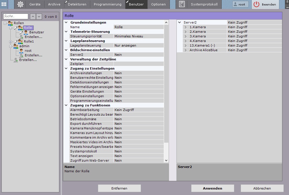 In der Voreinstellung ist eine Rolle registriert - admin und ein Benutzer - root. Der Benutzer root gehört zur Rolle admin und ist berechtigt, alle Komponenten des Videoüberwachungssystems zu konfigurieren. Zur Registrierung eines Benutzers mit individuellen Rechten muss eine neue Rolle mit diesen Rechten und ein neues Benutzerkonto angelegt werden.