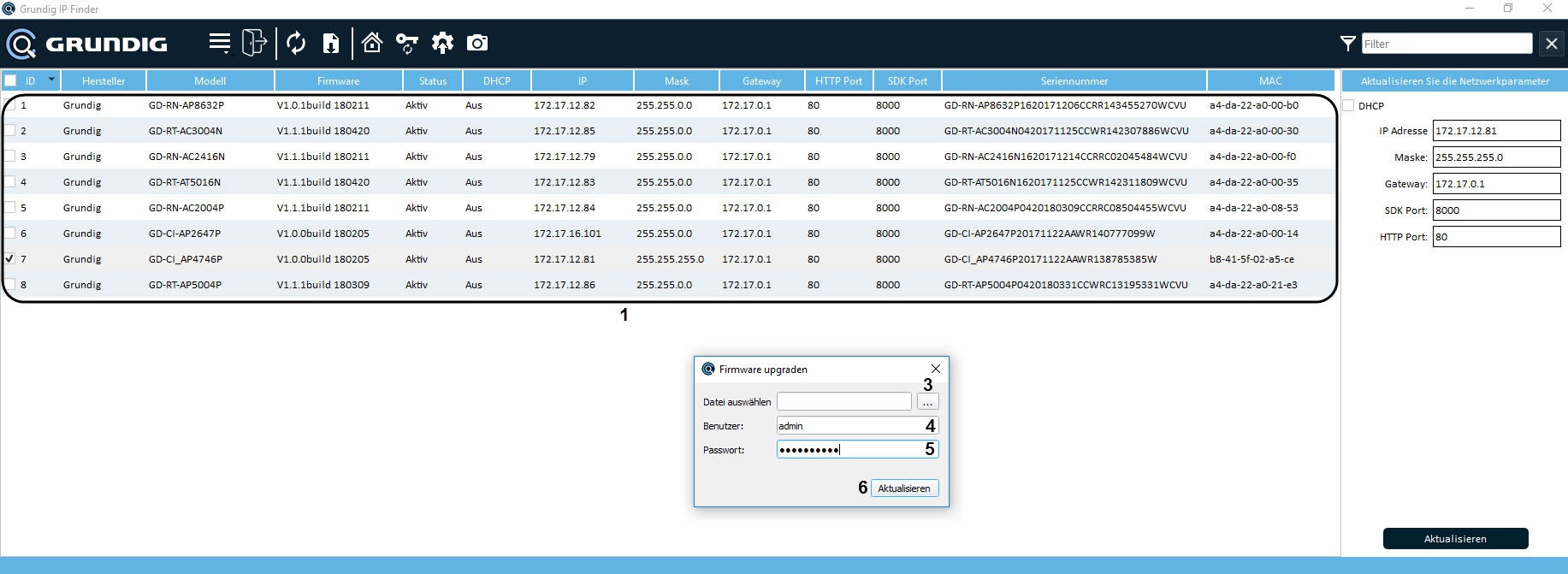 1. Wählen Sie die entsprechende Kamera in der Liste der Kameras (1) aus, bei denen Sie die Firmware aktualisieren möchten.