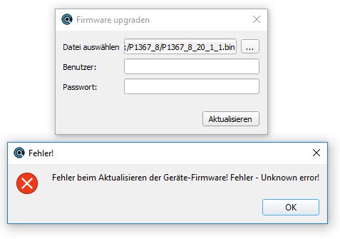 Wenn der Benutzername und das Passwort für den Zugriff auf die Kamera nicht angegeben sind, tritt nach dem Klicken auf die Schaltfläche Aktualisieren der Fehler "Fehler beim Aktualisieren der Geräte-Firmware! Fehler - Unknown error!" auf.