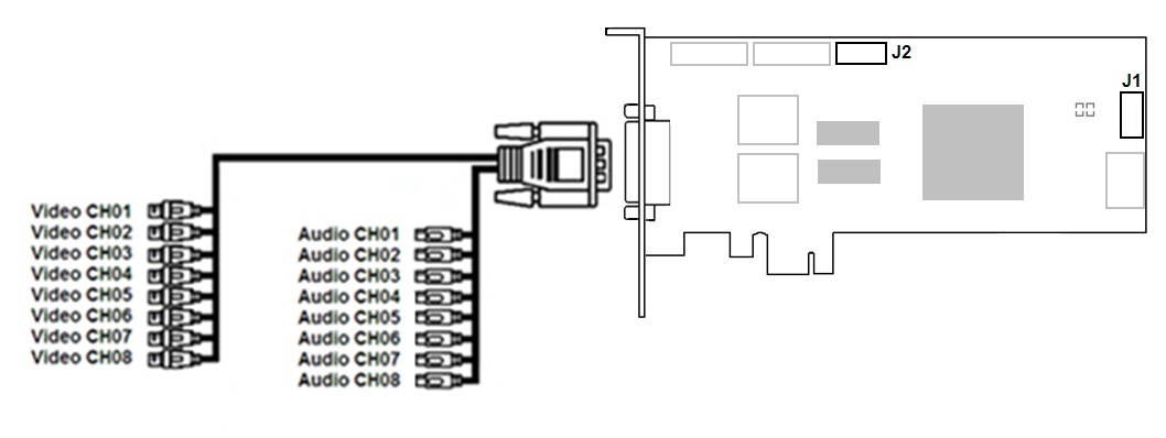 VRC7008L video capture card has a DVI pin. DVI /BNC interface cable is used for simultaneous connection of up to 8 cameras and 8 sound sources to external DVI pin of VRC7008L video capture card. DI/DO card is connected to the J1 pin. J2 pin corresponds to analog video out.