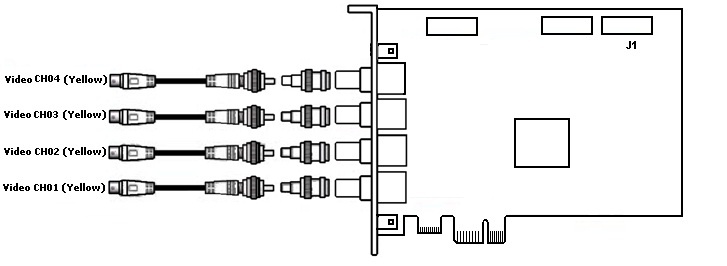 VRC6004 video capture card has four external BNC pins. Cameras are connected with the help of BNC pin. Simultaneous connection of up to 4 cameras is possible. DI/DO card is connected to the J1 pin.
