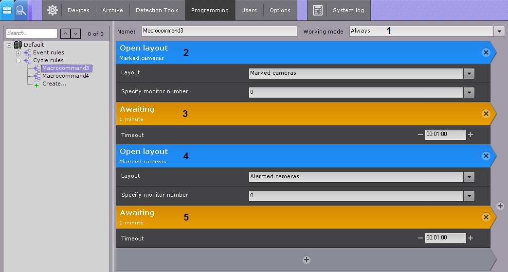 The cycle consists of alternating layouts with marked cameras (2) and layouts with alarmed cameras (4). Interval - 1 minute (3 , 5).