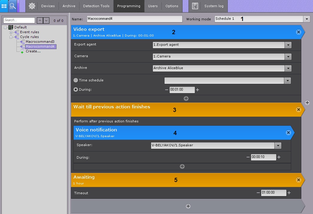 Every hour (5) video from camera 1 is exported (2). After the export is completed (3), an audio alert is sounded (4).