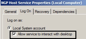 - Allow interaction of the server NGP Host service with the desktop: Start > Control Panel > Administrative Tools > Services > Net Logon -> Properties - Log on.