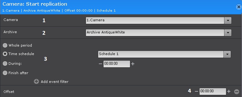 5. Specify Offset(4), if you specified Duration for replication. Video recordings from the period [start action - offset, start action + duration - offset] will be copied.