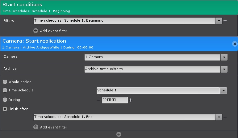 Select one or more end events. All video recordings between the start point (when the action starts) and the end point (when the event is received) will be copied.  Important! Replication will not start until the end event is received.