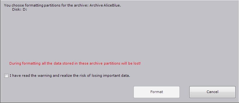 If volumes are configured in the form of partitions, a dialog box is displayed, warning about formatting of the relevant system disks. - Read through the list of partitions that will be formatted. If the list is correct, select I have read the warning and realize the risk of losing important data, then click Format. Otherwise, click Cancel to return to the archive settings.