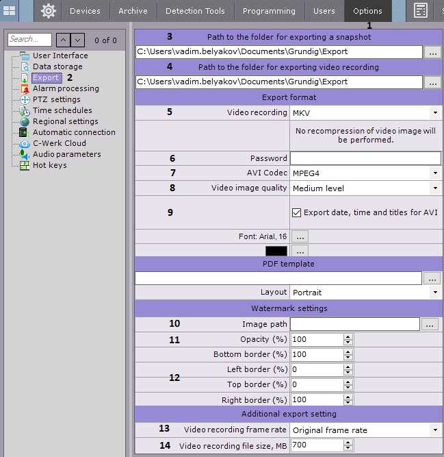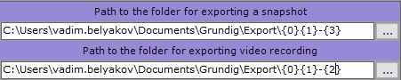 2. In the Path for snapshot export (3) and Path for video export fields (4), enter the full path to the folders where exported files are to be saved. To do this, click the  button .