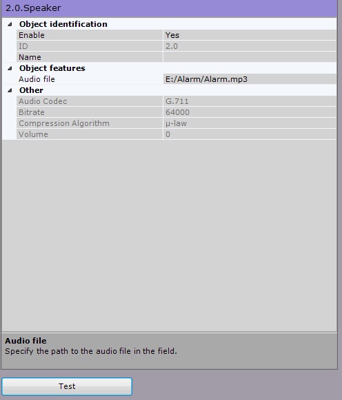 When you do this, the audio notification file whose path you indicated in the corresponding field plays back (see the section Configuring a Speaker Object).